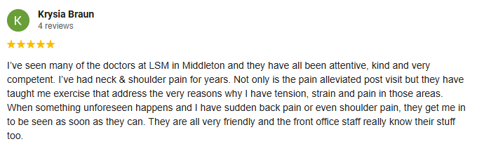 Chiropractic Testimonials General Office Hours Monday7:00am - 7:00pm Tuesday7:00am - 7:00pm Wednesday7:00am - 7:00pm Thursday7:00am - 7:00pm Friday7:00am - 6:00pm Saturday8:00am - 12:00pm SundayClosed Dr. Considine's Hours Monday6:50am - 6:00pm TuesdayNone Wednesday6:50am - 6:00pm ThursdayNone Friday6:50am - 5:00pm SaturdayNone SundayClosed Dr. Mikla's Hours Monday8:00am - 7:00pm Tuesday7:00am - 6:00pm WednesdayNone Thursday7:00am - 7:00pm Friday8:00am - 6:00pm Saturday8:00am - 12:00pm1st & 5th Sat of month SundayClosed Dr. Qualle's Hours Monday7:00am - 6:00pm TuesdayNone Wednesday8:00am - 7:00pm Thursday7:00am - 6:00pm FridayNone SaturdayNone SundayClosed Dr. Konkol's Hours MondayNone Tuesday2:30pm - 7:00pm WednesdayNone Thursday8:00am - 12:00pm FridayNone Saturday8:00am - 12:00pm2nd, 3rd, & 4th Sat of month SundayClosed LSM Chiropractic of Middleton 6704 University AveMiddleton, WI 53562 (608) 836-4542
